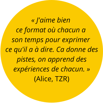 La consultante garantit le cadre, organise les prises de parole et s’assure que les temps de parole de chacun·e sont respectés. Elle intervient pour apporter des informations, des précisions, une aide ponctuelle. Elle est à la disposition des inscrits en fin de séance pour un échange plus libre si besoin.