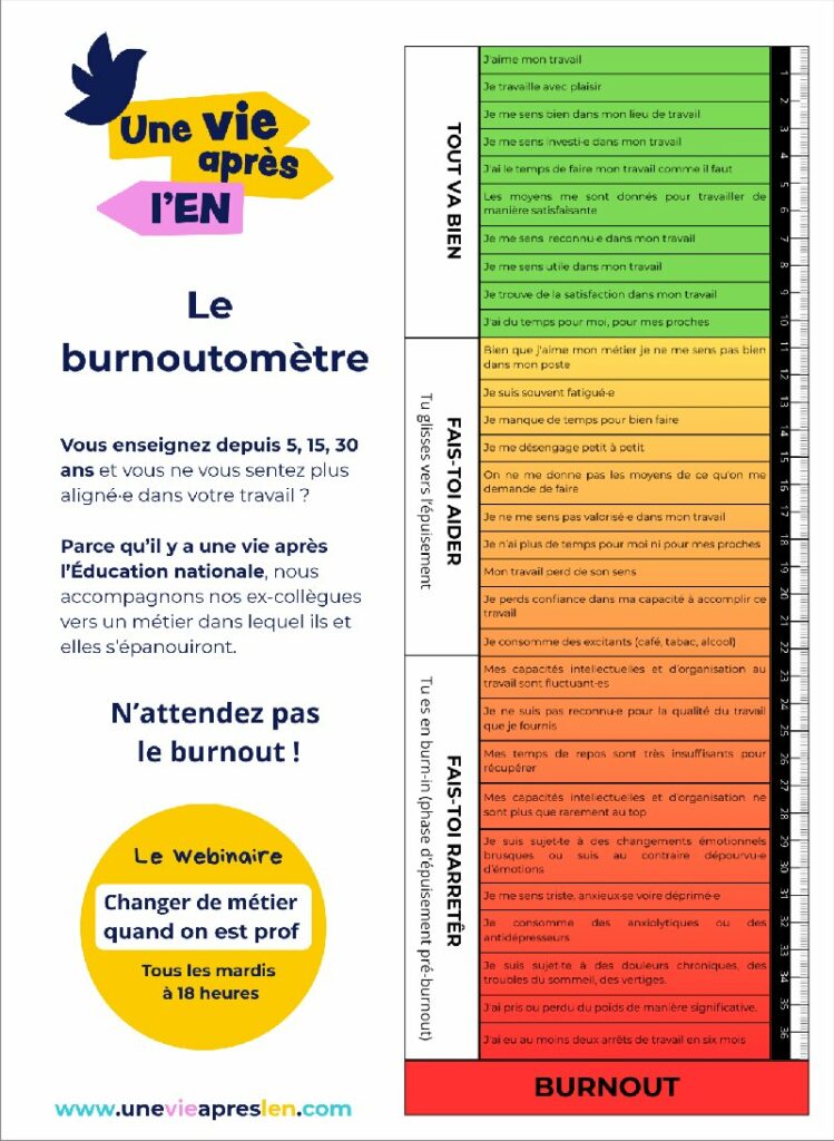 Cliquez sur l’image pour télécharger l’affichette pour la salle des maîtres / des profs qui permettra à vos collègues de mesurer leur degré d’épuisement :